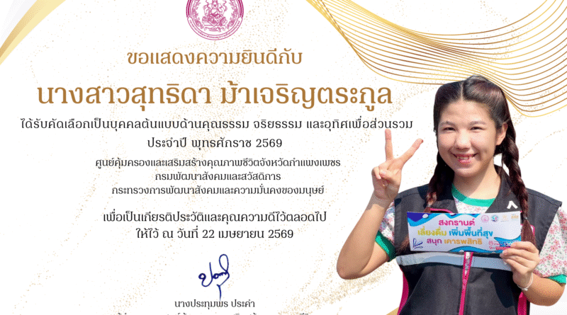 ขอแสดงความยินดีอย่างยิ่งกับ นางสาวสุทธิดา ม้าเจริญตระกูล นักสังคมสงเคราะห์ ศูนย์คุ้มครองและเสริมสร้างคุณภาพชีวิตจังหวัดกำแพงเพชร ที่ได้รับการคัดเลือกให้เป็น “บุคคลต้นแบบด้านคุณธรรม จริยธรรม และการอุทิศเพื่อส่วนรวม” ประจำปีพุทธศักราช 2569